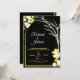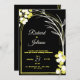 A black and white wedding invitation with blue and white flowers on a black background. The invitation features the names of the bride and groom, Richard and Juliana, along with the date, time, and location of the wedding.