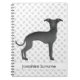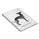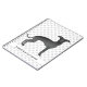 Destei's original cartoon illustration of a cute black color Italian Greyhound / Iggy breed dog. The background has a pattern of gray dog paw prints. There is also a personalizable text area.