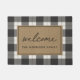 Add a farmhouse style touch to your entryway with this rustic buffalo plaid patterned doormat in dark charcoal grey, black, and ivory with tan accents. "Welcome" appears in the centre in casual handwritten script lettering; personalize with your family name beneath.