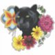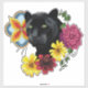 A powerful black jaguar tattoo-style portrait. Surrounding the jaguar’s face are vibrant, colourful Mexican flowers in reds, fuchsia and yellows. Behind the Jaguar is a traditional Mexican tile in a backdrop of teal.