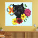 A powerful black jaguar tattoo-style portrait. Surrounding the jaguar’s face are vibrant, colourful Mexican flowers in reds, fuchsia and yellows. Behind the Jaguar is a traditional Mexican tile in a backdrop of teal.