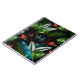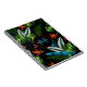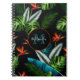 A chic black background.  Green and blue tropical rain forest, jungle. Palm tree and banana leaves, foliage with red and orange florals, flowers.  A black and orange frame with space for your name and monogram letter.  The name is written with a modern hand lettered style script.