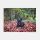A black Labrador retriever laying amongst brown, yellow and orange autumnal leaves, with leaves falling through the air