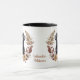 A pretty autumn wreath in tones of cinnamon brown, tan, and cream surround the image of a black Labrador Retriever Dog. The image is printed twice on the mug, with your custom text between them.