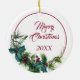 On the front of this Holiday ornament is an image of a beautiful black Labrador Retriever Dog peeking out of a holly and evergreen bough. Red berries and pine cones decorate the holly and pine sprigs. The image is placed on a white circle within a thin red line circle. The back of the ornament has the same evergreen bough wreath and circle with your custom text in red.
