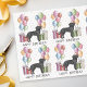 Destei's original cartoon illustration of a cute black Labrador Retriever breed dog. The dog is placed in a colourful birthday setting with pastel colour birthday balloons and gifts. The pastel colours include pink, green, blue, red, orange and purple. The background has a playful pastel colour polka dot pattern. There is also a personalizable text area that now reads: "Happy Birthday!". The design is placed six times creating a small pattern.
