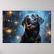 A black Labrador Retriever is the central focus of the image, its head tilted upwards, mouth slightly open, revealing a pink tongue. The dog's fur is a deep black, contrasting with the snowy, blue-toned background. The background features a blurred forest scene with soft, glowing lights scattered throughout, creating a magical and whimsical atmosphere. Perfect gift for labrador lovers.