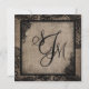 Elegant black lace over grunge burlap background with monogram elegant modern goth wedding invitation card.