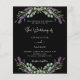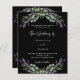 A black background decorated with lavender flowers and eucalyptus greenery. Personalize and your names and details.