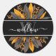 Script de calligraphie de tournesol rustique Étiquette monogrammé pour enfants. Tournesol unique et tendance avec pétales en motif gris, jaune, orange et léopard, avec un modèle monogramme personnalisé et élégant nom de script de calligraphie modèle. Ce joli étiquette autocollant inspiré de la ferme ferait un étiquette de nom élégant sur le thème de l'été que vous pouvez mettre sur la propriété de votre enfant avant de les envoyer au camp, à l'école, etc.
