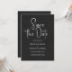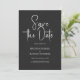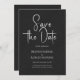 Whimsical minimalistic modern, customizable white script typography, elegant save-the-date invitation. The black colour printed linen texture background adds a touch of organic feel of classic elegance. Other colours are available.