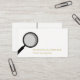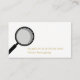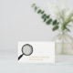 Stylish minimalist business card in gold, black, and white with a large magnifying glass. A clean minimalist business card for a private eye.