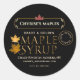 This maple syrup label can be customized with your business name, address and maple syrup volume in ounces and milliliters. There is a handy list of common container sizes with their conversions in the form field where you fill in your information. Black background with gold text and border. For a special touch, the word “maple syrup” has a gold gradient. Two sugar maple leaves and an editable circular logo with "Spring Season 202X" add a special touch.