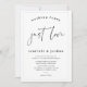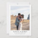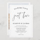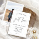 This nothing fancy just love wedding invitation features a modern calligraphy font heading and a fine line border. The couples photo appears on the back in a white frame with a fine line border.
