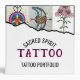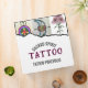 Features 3 photo spots, black modern and pink decorative typography on the front. Black modern text on the spine and black modern text for your name, credentials, phone number, address and personal contacts with QR code and personal photo on the back, all on a white background color. Perfect for tattoo parlor owners or tattooists to show their photos for a visual showcase the kind of work they do.