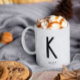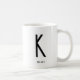 Minimalist but stylish, white personalized mug with black initial letter monogram and name across the letter. A perfect gift or personal accessory that is easy to personalize (just click on the button 'PERSONALIZE').