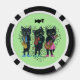 These poker chips have three fun black cat musicians with green eyes playing a guitar, violin, and saxophone with a heart made of music notes behind them on a light green background. Customise your initials or text with the templates.