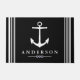 Anchors away! Greet your guests with this statement making white nautical anchor doormat.. The background is black with personalized family name text in white. This doormat is elegant, chic, and would make a great impression on your house guests as they are welcomed to your home!