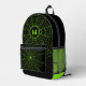Black neon green spider web Halloween Monogram Printed Backpack. Monogram Personalize with your custom initial and name. Accessory Halloween inspired gift with Black neon green spider web. Elegant, cool and fun pattern. Spooky Halloween cobweb design on custom black.