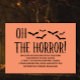 Get ready for a frightfully fun night with this bold Halloween party invitation, featuring the playful phrase “Oh the Horror” in spooky typography, complete with flying bats and eerie flair. Set against a vibrant orange background with crisp black text design, this invite strikes the perfect balance between creepy and cool. Ideal for boos and booze–themed gatherings, Halloween cocktail parties, or adults-only celebrations, the simple layout and modern design make it easy to showcase your party details with style. A must-have for hauntingly good times!
