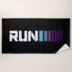This black sports beach towel features a white typography "RUN" slogan with blue and purple ombré block stripes.