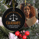 This modern black and orange custom law school graduation Christmas ornament features classy typography for a class of 2024 graduate and their professional photo on the back. Customize with your graduating year under the white scales of justice for a great personalized lawyer or attorney photograph gift.