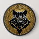 Detailed emblem showcasing a stylized black panther head central to a golden geometric pattern.