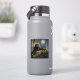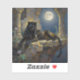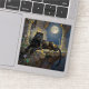 A black panther themed sticker. On the front is an illustration of a majestic black panther with fur like molten black and gold, laying on a cliff ledge bathed in ethereal moonlight. Intricate carvings adorn crumbling stone pillars, and bioluminescent flora casts a soft, otherworldly glow. The scene is rendered in a rich, textural oil painting style with thick, .