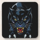 A black panther's head and shoulders are depicted in a graphic style. The panther is centred in the image, facing the viewer directly. Its fur is a deep, solid black. The eyes are bright yellow, and the mouth is open in a roar, revealing sharp teeth and a bright red interior. The panther's expression is fierce and aggressive. Its body is powerful and muscular, and its claws are extended. The background is completely black. The style is bold, graphic, and stylized, emphasizing the panther's strength and power. The composition is simple and focused on the animal's features. The lighting is dramatic, highlighting the panther's form and features against the black background. The perspective is directly in front of the panther. The overall atmosphere is intense and powerful. Important details include the panther's powerful jaw muscles, the sharp teeth, and the piercing yellow eyes, all emphasized by the graphic style and contrasting colours.