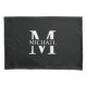featuring personalized white monogram in classic serif font style with box of name in the middle of monogram on black background.