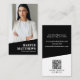 This modern vertical business card now features deep black backgrounds on both the bottom front and the top back, paired with clean white fonts and black accents for a sharp, contemporary look. The front includes your photo, name, and title or business name in a polished layout that stands out against the dark backdrop.