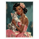 The image depicts a glamourous, vintage-inspired scene featuring a black woman dressed in an elegant, strapless pink gown adorned with delicate floral embroidery. She exudes sophistication, accessorized with a multi-layered pearl necklace, matching earrings, a sparkling bracelet, and a large, ornate ring on her finger. A pink flower with a jewelled centre adorns her voluminous, retro-styled hair, which is swept into an intricate updo. In her arms, she gently holds a small, tabby kitten with a white and grey striped coat, its wide eyes gazing outward. The background is a textured, teal-blue wall with a slightly distressed appearance, adding a touch of contrast to the overall luxurious and feminine aesthetic of the scene.