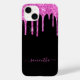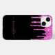 An elegant, girly and glam phone case. Hot pink coloured coloured faux glitter drips. A chic black background. Personalize and add a name, written with a modern hand lettered style script with swashes. Pink coloured letters. To keep the swashes only delete the sample name, leave the spaces or emoji's in front and after the name.