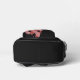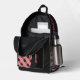 Two-tone black and pink. Pink checkered appliqués on a black backpack. Add your name to the front and your text to the right and along the zipper. Alternatively, you can change the appliqué designs to your own images or pattern.