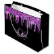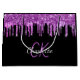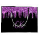 An elegant black background decorated with purple and pink faux glitter drips, paint dripping look. Personalize and add a date, name and age. A modern hand lettered style script, purple letters. Perfect for gift wrapping or party favours for birthday parties, bridal shower and baby showers.