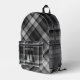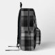 Black plaid backpack for adults or kids. All over plaid with name template on the front zipper pocket. Pine tree images, in shades of black and grey, make a little forest beneath the name. Use the name template, or don't.