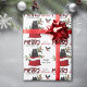 The repeated pattern on this cute Christmas wrapping paper is an image of a black Pomeranian dog peeking out from a red and white Holiday gift bag. Behind him is a sprig of holly and red berries. A red and black bullfinch bird is about to land. Stylized red and black buffalo plaid text says MERRY CHRISTMAS", and "Happy New Year" is in dark green. Your own signature is in two fields for you to customize.