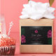 Make a lasting impression with this elegant and exotic product label design featuring pretty wine red hawaiian flowers and green palm leaves on a black background. A cool palm leaf shadow matching to the border frames.