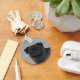 Destei's original cartoon illustration of a cute black coat colour Pug breed dog's face. The background colour is grey with a light decorative texture. The texture can be removed, if so wished. On the other side there is a personalizable text area for a name or other custom text.