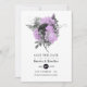 Watercolor floral gothic wedding save the date in accents of lavender purple, black and faux glitter silver designed to be quickly and easily customized to your event specifics.