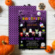 Invite your friends for some spooky fun with this black and purple bootastic Halloween costume party invitation. This design features a black and purple spooky house, sky and tree background with ghosts, bats, spiders and all your friends dressed in their best costumes.