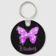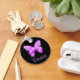 A butterfly shape filled with shades of purple and shining stars in horizontal stripes. Black background. Customize and add your name with purple letters.