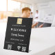 A black background. Personalize and add your company name, business logo, text, room number. QR code to your website, event program etc. White text.