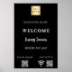 A black background. Personalize and add your company name, business logo, text, room number. QR code to your website, event program etc. White text.