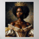 This poster features artwork of a beautiful, elegant dark-skinned queen wearing intricate, elaborate royal dress and a jewelled tiara - classic oil painting portrait style with a modern twist! This stunning woman is from the African diaspora. She has short hair styled in curls.