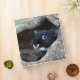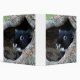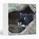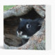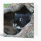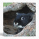 Adorable black and white bunny poking it's head out of the hollow of a tree.