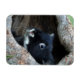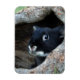 Adorable black and white bunny poking it's head out of the hollow of a tree.