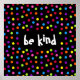 A colorful , fun poster that features a confetti polka dots pattern in black and rainbow and the words ‘be kind’ in the center . Text can be personalized.