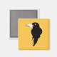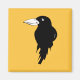 Image of a black crow / raven with a large white beak. Seems to be smiling about something. Soft yellow background.