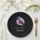 Paper plates with an image of a black crow with purple pink wings. A pink watercolor splatter behind this lovely mystical bird.